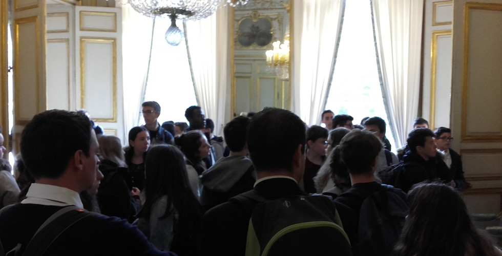 Devant la nécessité de justifier de la présence d'une professeur de mathématiques et d'arts plastiques sans trop perdre de temps, nous nous sommes rendus dans un seul et même lieu pour nous acquitter de cette double corvée : le musée des Arts et Métiers. La visite guidée a également permis aux élèves de revenir sur les connaissances et compétences acquises dans les cours du sergent instructeur Lamontagne et du caporal Bousquet. Nous nous sommes ensuite rendus au palais de l'Elysée où, passé l'émotion d'entrer dans la cour d'honneur et de se faire photographier sur le perron, nous avons eu droit à une visite sous la conduite de « Michel », un guide mémorable qui su faire partager sa passion du dressage de table à base de « plateau-tréteau » et de vaisselle de Sèvres, ainsi que son goût pour les chaises Louis XV aux pieds cannelés ou torsadés. Les vases offerts par le général Trochu - « participe passé du verbe trop choir, héhéhé » -, les tapisseries des... (silence gêné) gobelins bien sûr, les tapis de la... (silence encore plus gêné) savonnerie, évidemment, commandés par – vous le savez tous... (silence de plus en plus pesant) la belle sœur de la régente du trône du dauphin Flipper et de la marquise de la principauté de Nailloux... Bref : du contenu, du contenu, du contenu. Notons d'ailleurs qu'au moment de quitter les lieux, les élèves ont pu apercevoir furtivement François Hollande arrivant en voiture dans le jardin avant de s'engouffrer dans le palais ! Après un tour sur les Champs-Elysées, nous avons regagné l'auberge sous l'air de la romance de Paris (Charles Trénet) avant de clore la journée, dans une salle de spectacle, par le résultat du rallye. Les élèves ont alors découvert qu'ils étaient bizarrement tous arrivés à égalité ! Des prix ont néanmoins été remis : prix de la solidarité et de l'unité pour l'équipe de Mme Bion, prix de l'orientation et de la concorde pour celle de Mme Kaminski, prix du fair-play pour celle de M. Marty et prix de la combativité pour la mienne. L'occasion de constater une fois de plus que l'on transmet surtout ce que l'on est.